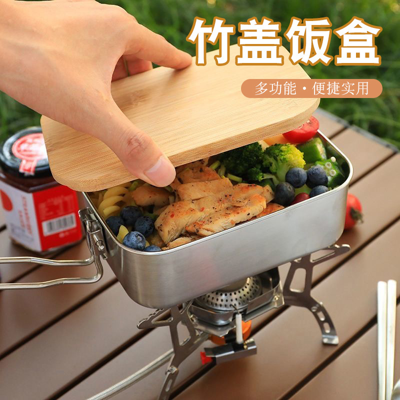 Kotak makan siang baja tahan karat 304, setelan penutup papan potong bambu luar ruangan lipat portabel untuk berkemah, panci sup, dan peralatan makan, kotak bento