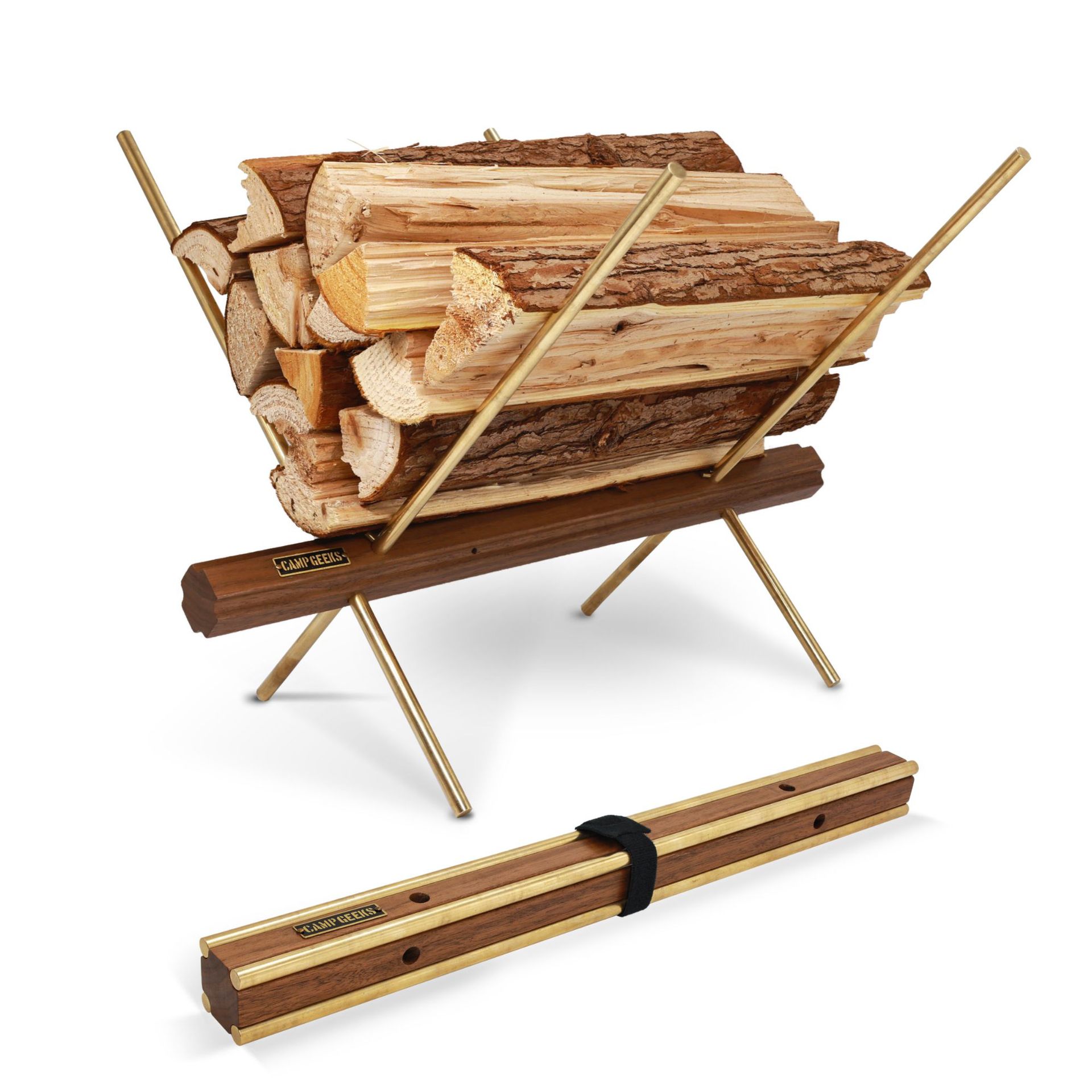 CAMPGEEKS rak kayu bakar berkemah luar ruangan rak penyimpanan kayu bakar kuningan kayu kenari minimalis portabel