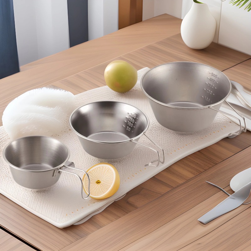 Mangkuk Ruler Salju Mulut Stainless Steel Dapat Digantung dengan Pegangan Skala Mangkuk Portabel Camping Lipat Luar Ruangan Cangkir Ruler