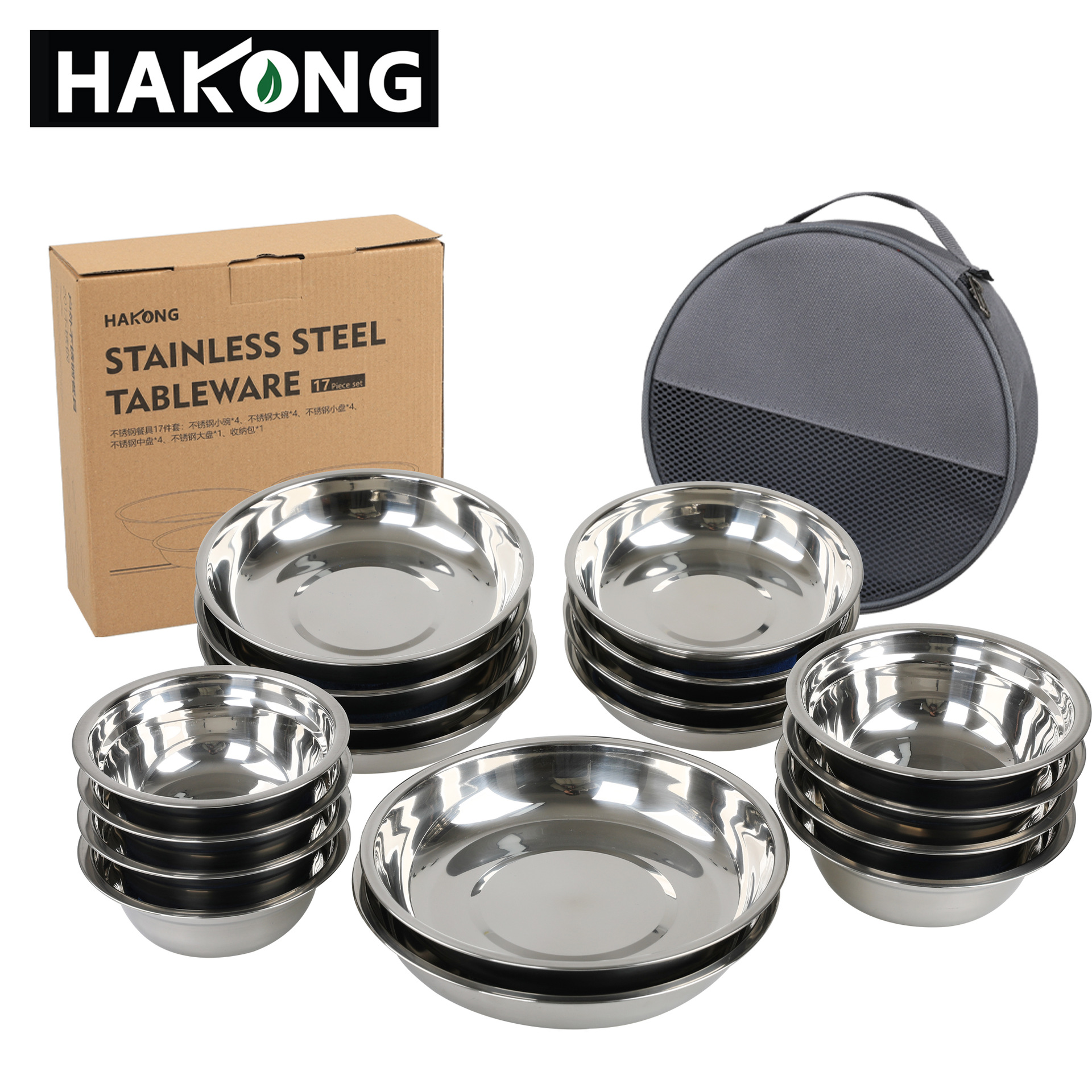 Piring baja tahan karat 17 potong, setelan peralatan makan barbeque berkemah portabel, berkendara sendiri piring barbekyu, mangkuk sup luar ruangan