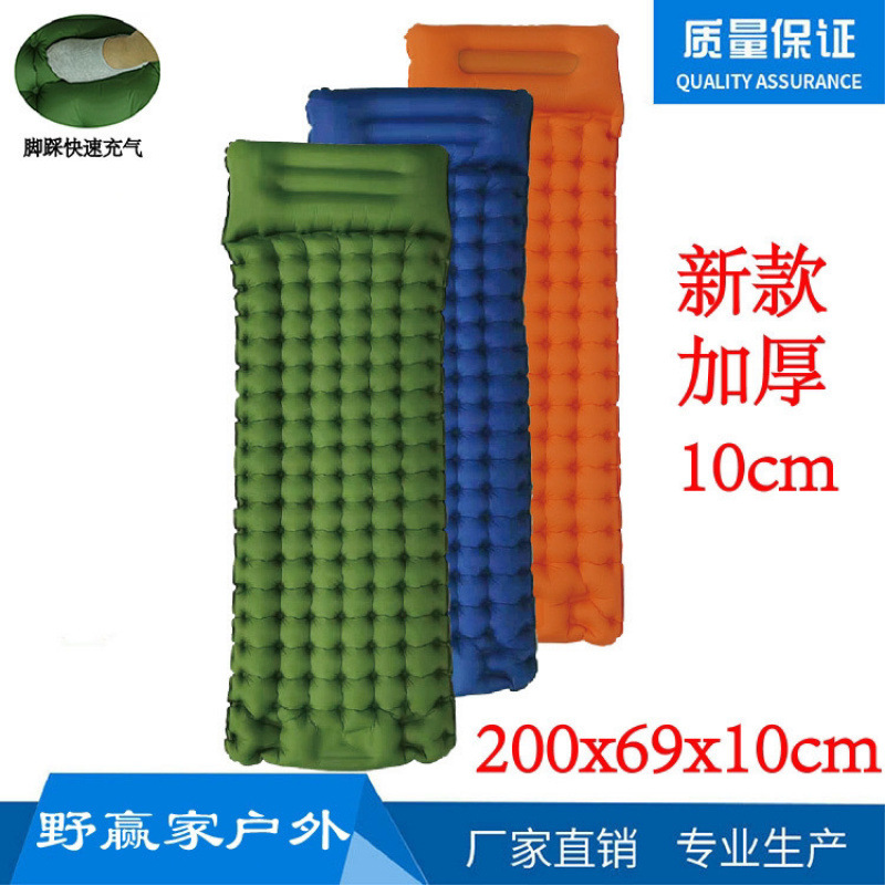 Matras tidur tiup untuk berkemah di luar ruangan, anti air, berbahan kain nilon 40D, dapat diisi angin dengan kaki.