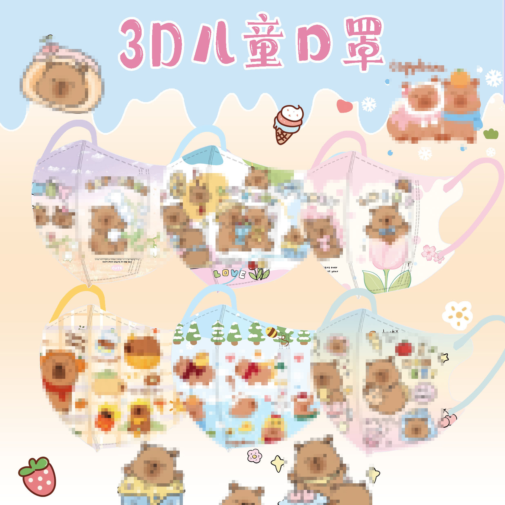 Topeng Anak-anak dengan Pola Kartun Capybara 3D Sekali Pakai