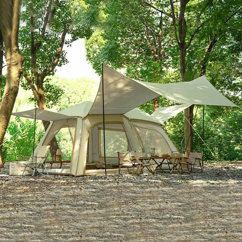 Tenda luar ruangan 8-12 orang, isolasi panas perlindungan matahari tahan hujan dua kamar tidur dan satu ruang tamu berkemah mengemudi sendiri tenda besar perjalanan