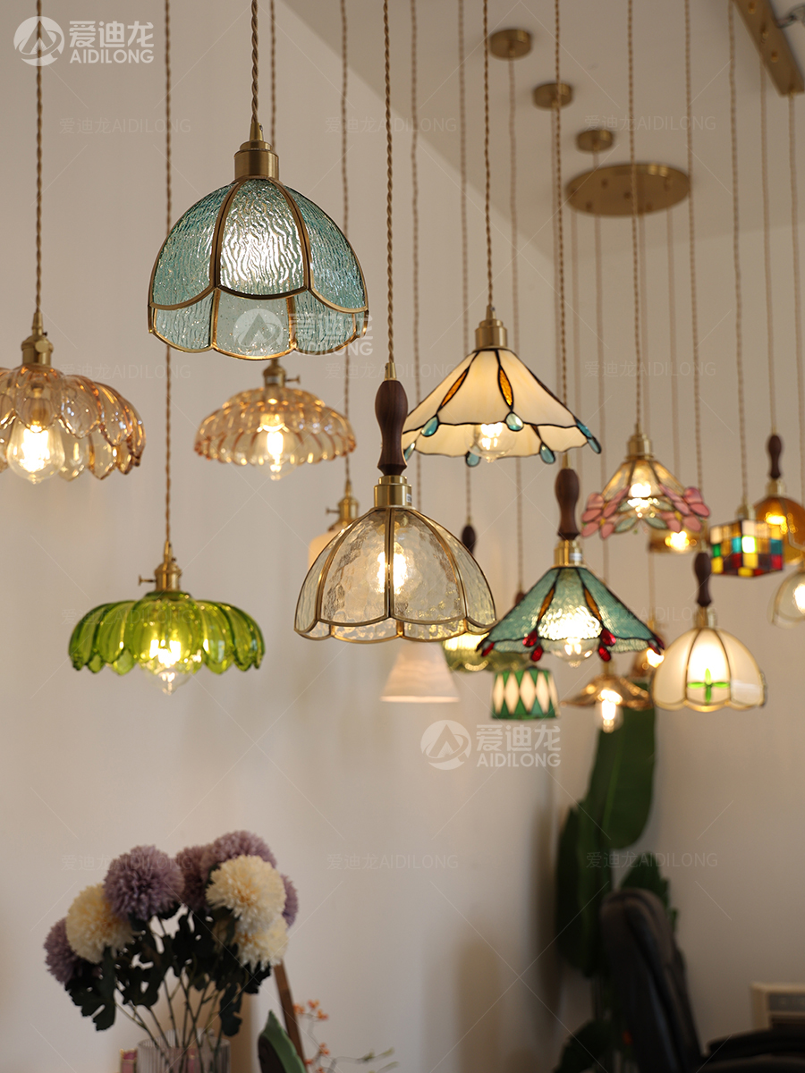 复古法式黄铜纯手焊锡灯美式风格床头餐厅过道彩色玻璃小吊灯