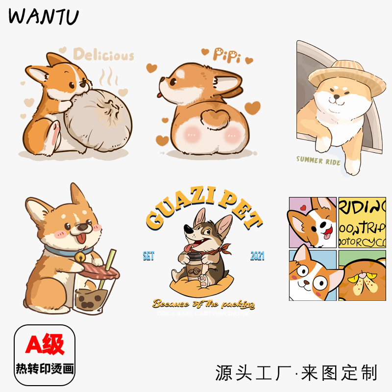 Stiker pola Trendi Tepi tidak berperekat, stiker cap panas pabrik pakaian hewan peliharaan Corgi lucu cap panas