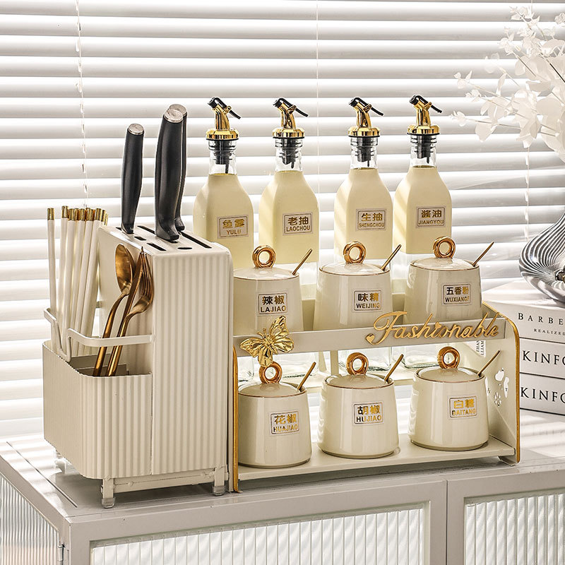 Putih susu stoples bumbu setelan botol saus dapur pot minyak kaca keramik stoples bumbu dengan tempat pisau botol bumbu kombinasi