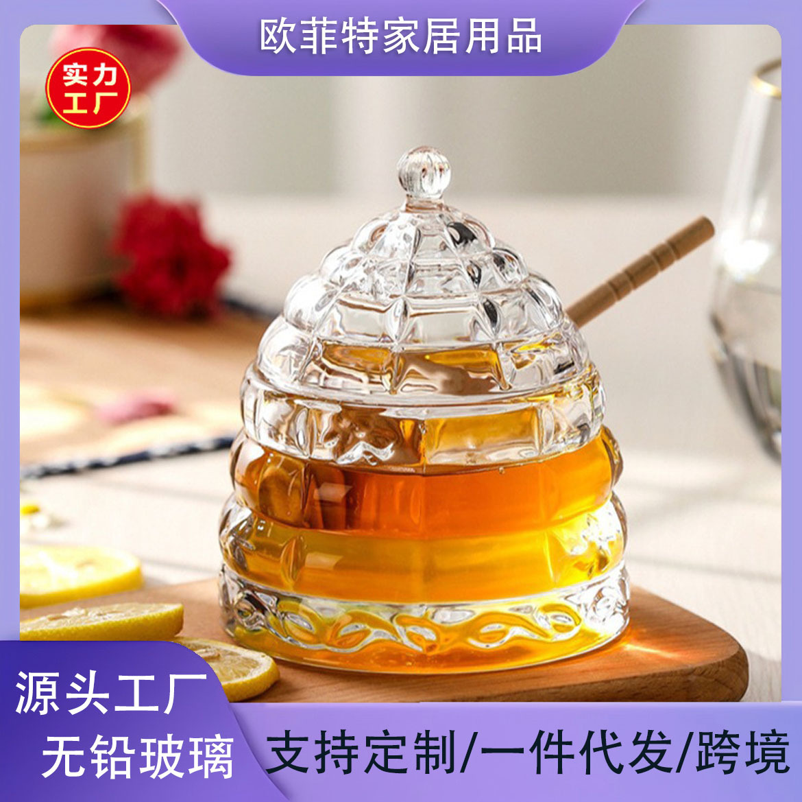 Stoples penyimpanan sirup rumah tangga, toples penyimpanan madu kaca kerucut gaya Eropa dengan sendok kayu