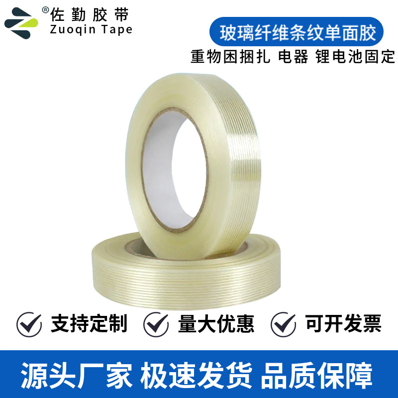 Pita fiberglass satu sisi dengan viskositas tinggi, tahan suhu tinggi, bergaris, transparan, daya rekat kuat, tahan aus, tahan tarikan, dan diperkuat.
