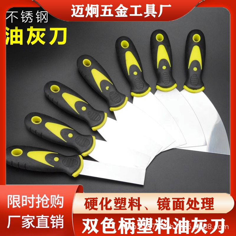 Tepuwang pisau dempul pegangan dua warna plastik, alat plester dinding, sekop pembersih, pisau dempul stainless steel