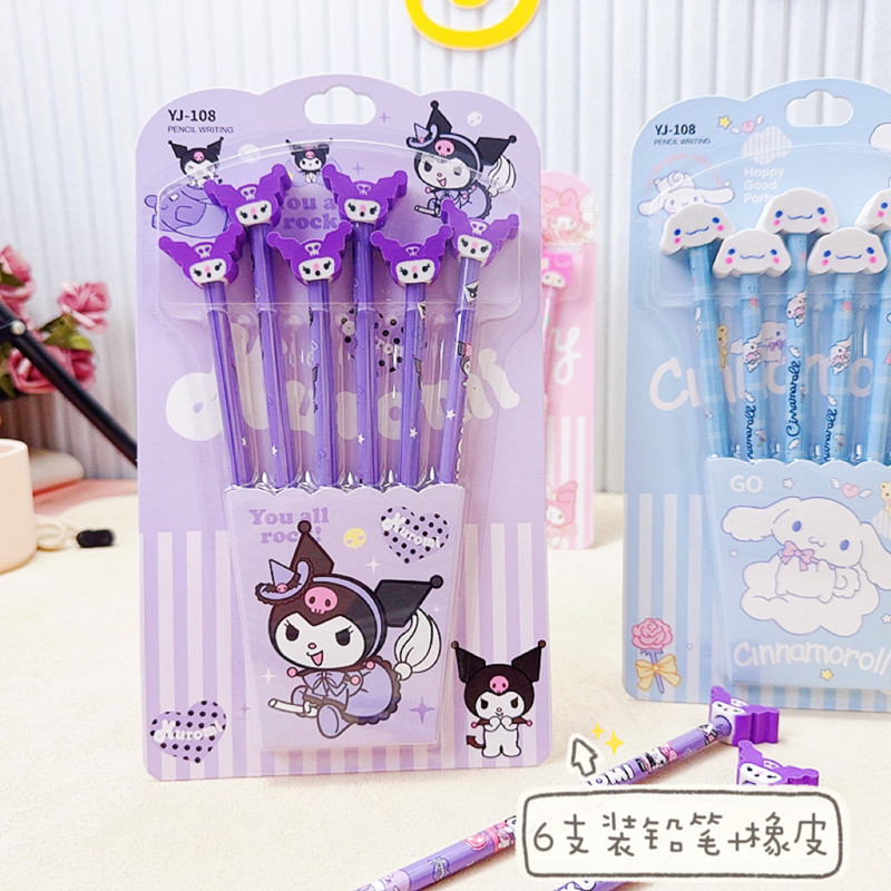 Kartun 6 Pack Pensil HB Set Alat Tulis Set Penghapus Tiga Dimensi Anak SD Model Baru Sanrio