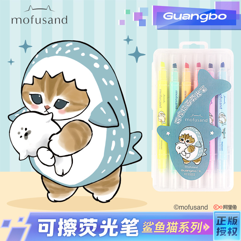 广博K23202正版鲨鱼猫卡通学生用可擦荧光笔绘画手账标记文具套装