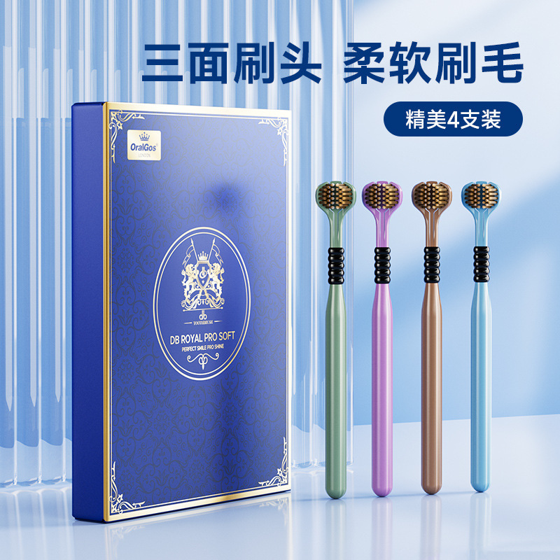 【四支礼盒装】高级软毛三面牙刷大人家用护龈三头牙刷厂家正品