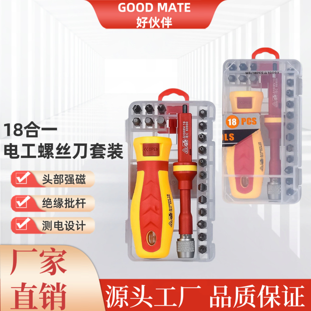 Peralatan Perkakas 18-in-1 Set Obeng Elektrik, Anti Selip, Berinsulasi, Baja Krom Vanadium, Magnetik, Multifungsi