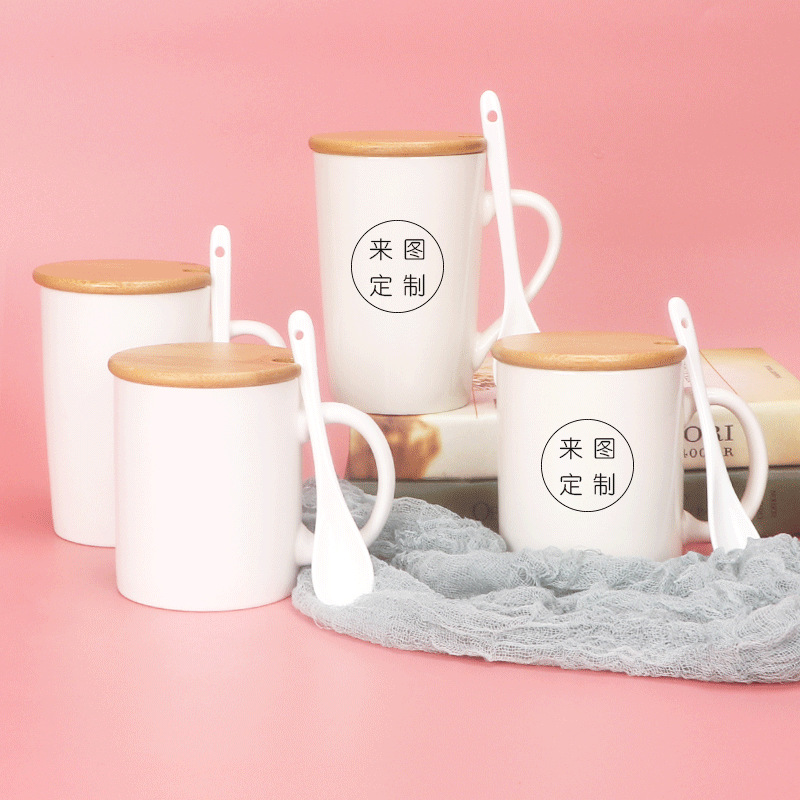 Mug keramik putih sederhana dengan tutup kayu, sendok porselen logo dapat dicetak cangkir susu hadiah