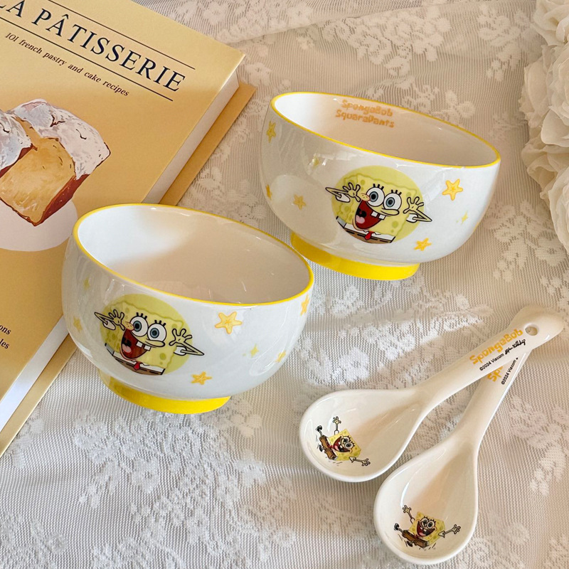 Spongebob Pai Bintang Keramik Nasi Mangkuk Nasi Sendok Makan Set Peralatan Makan Rumah Tangga Anak-anak Pelajar Makanan Penutup Mangkuk Oatmeal