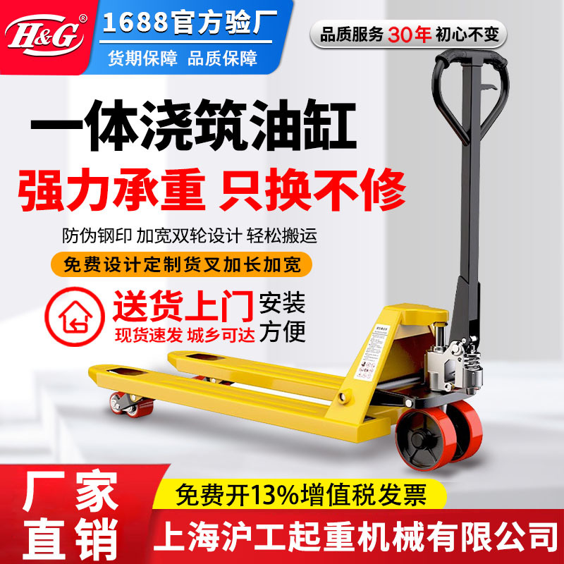 Truk forklift hidrolik manual Shanghai Hugong untuk gudang pabrik, trailer dorong tangan 2/3 ton, truk bongkar muat hidrolik
