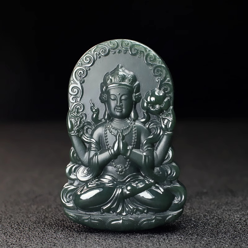 Giok Hetian alami Xinjiang, liontin giok Guanyin empat lengan Safir dua sisi Gong Guanyin giok liontin pria