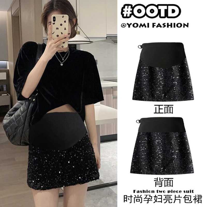 Rok pendek wanita hamil 2024 musim semi dan musim gugur rok payet hitam ramping Bling modis rok tas Semua cocok