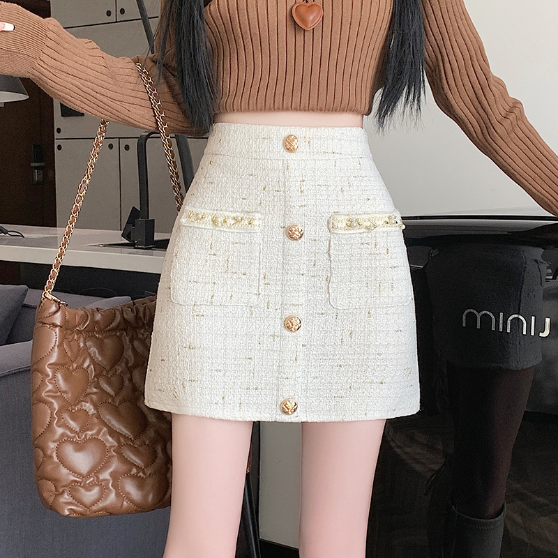 Rok gaya channel putih, rok pendek wol a-line wanita, Rok bungkus lengan ketat musim gugur dan musim dingin 2023