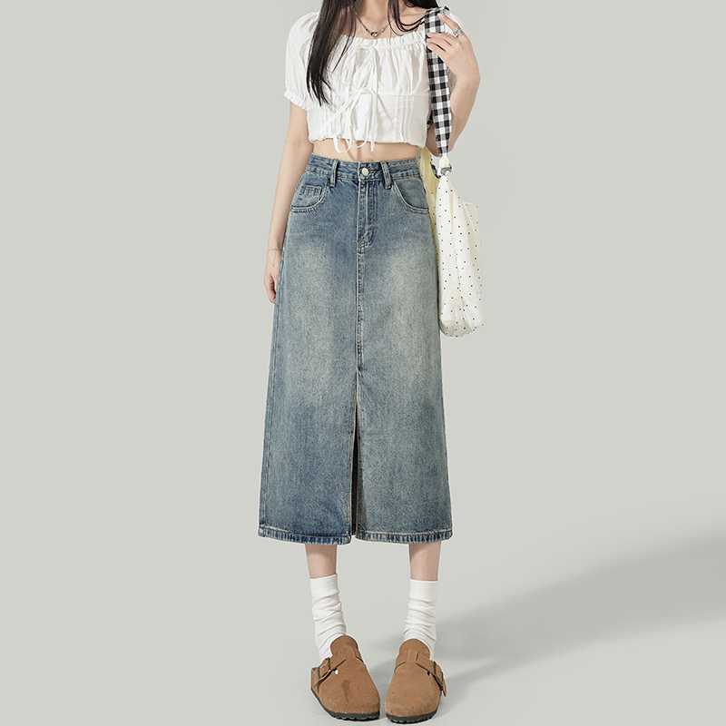 Rok Setengah Badan Denim Model Lama Retro Rok Niche Bercabang Pinggang Tinggi Model Panjang Musim Semi Wanita Grosir Rambut Pengganti