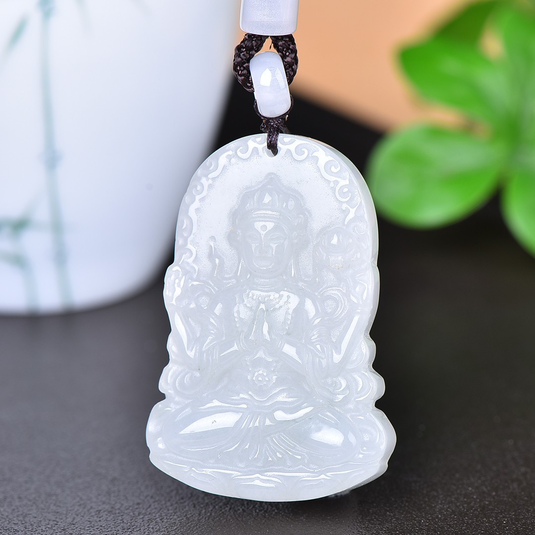 Tianshan alam zamrud empat lengan Guanyin liontin putih giok Maitreya kalung liontin pria dan wanita Cina perhiasan sederhana