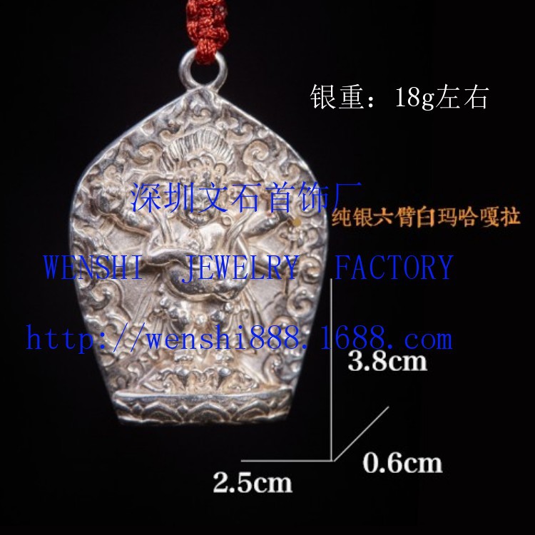 Jiatuo hidup Buddha terukir antik tua menghapus perak murni enam lengan putih Mahaga liontin