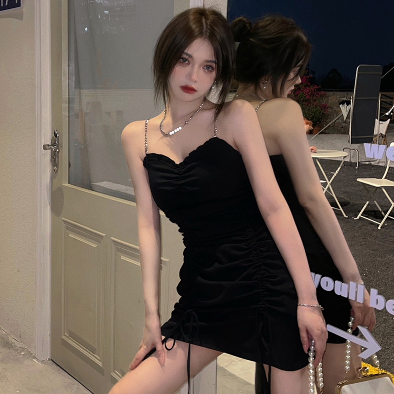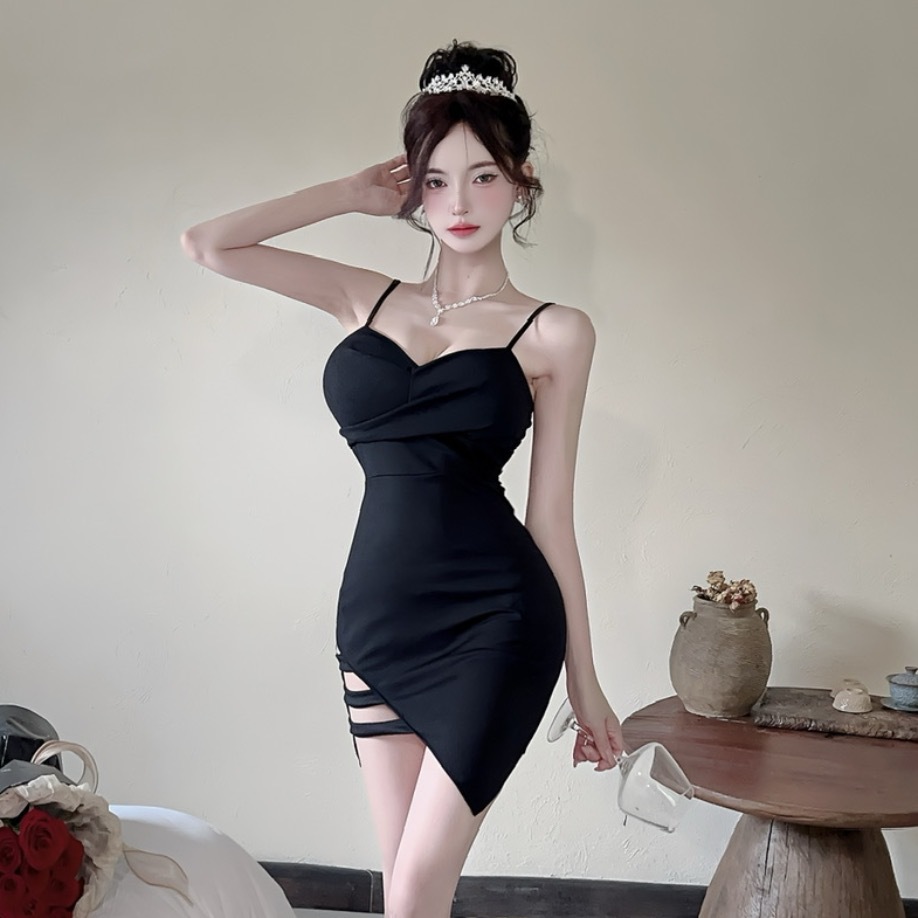 Gaun Dada Rendah dengan Tali Gantung Sederhana Seksi Sosialita Rok Pendek Lengan Bercabang Tidak Beraturan Ketat Terlihat Tubuh