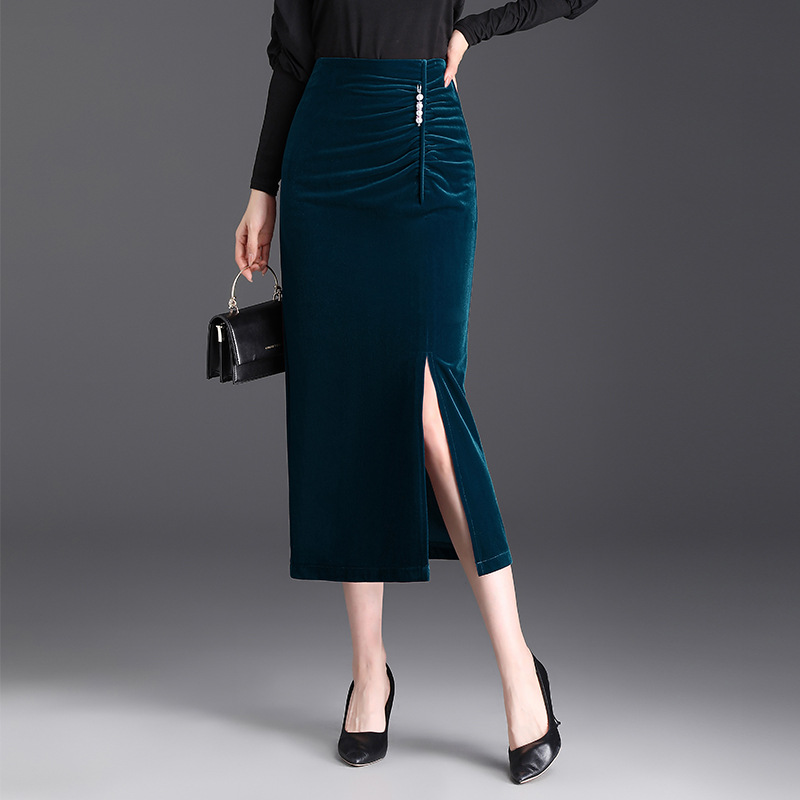 Rok Ibu lurus beludru emas wanita, bawahan tas pinggang tinggi terpisah musim gugur 2024