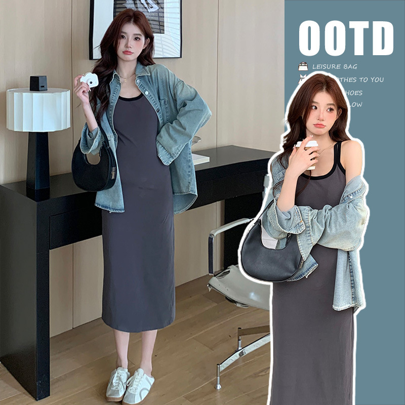 Real shot dalam stok retro gradien mantel Denim + Gaun Lengan belahan belakang ramping gaun bersalin dua potong