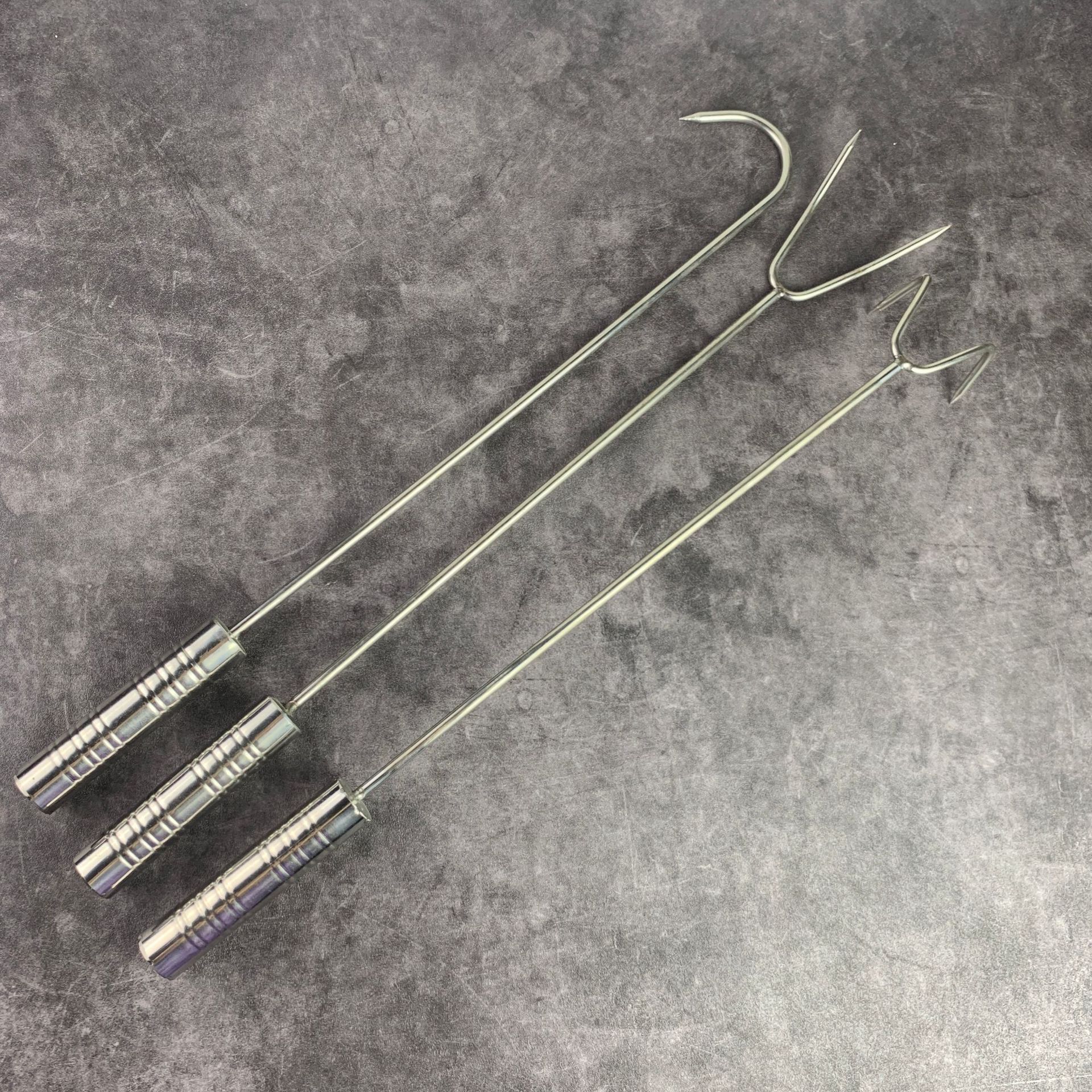 Kait daging pegangan kayu, kait daging, kait daging pegangan baja, kait daging panggang, kait daging babi, kait daging babi, garpu barbekyu tebal