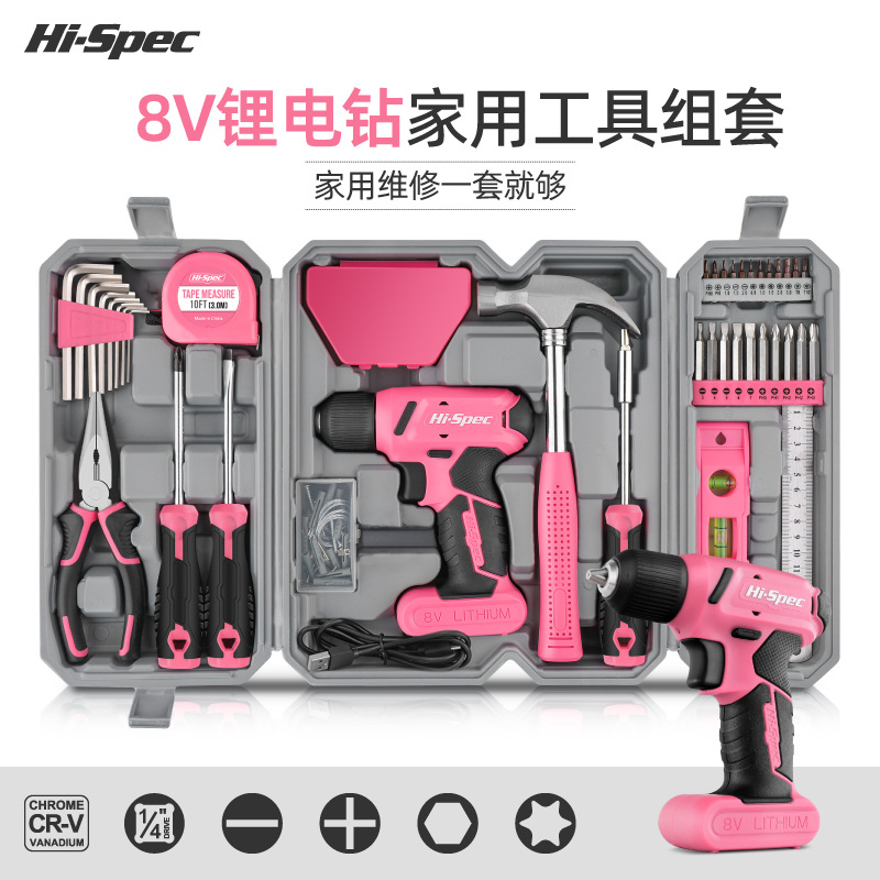 Hi-Spec obeng listrik isi ulang 8V, setelan bor pistol elektrik rumah tangga multifungsi merah muda