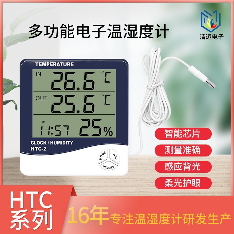 Pengukur Suhu Dalam dan Luar Ruangan Pengukur Suhu Rumah Tangga Pengukur Suhu Ganda Tampilan Tahan Air Probe Pengukur Suhu Elektronik HTC-2