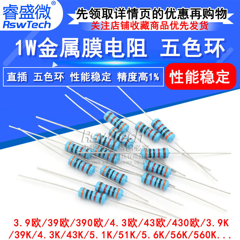 Steker langsung 1W film logam resistor 1% cincin lima warna 62 620 6.8K 43 430 5.1K 390 cincin warna