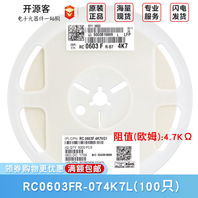 0603 SMD resistor 4.7 kΩ (4701) ± 1% 4K7 RC0603FR-074K7L(100 buah)