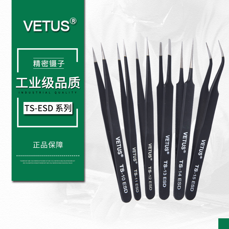 Pinset VETUS baja tahan karat, pinset presisi baja tahan karat warna hitam, TS-10/11/12/13/14/15ESD