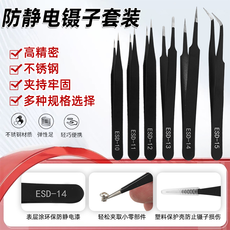Pinset setelan baja tahan karat 6 buah 1mm15 ESD tas kuning Pinset alat bongkar siku runcing hitam