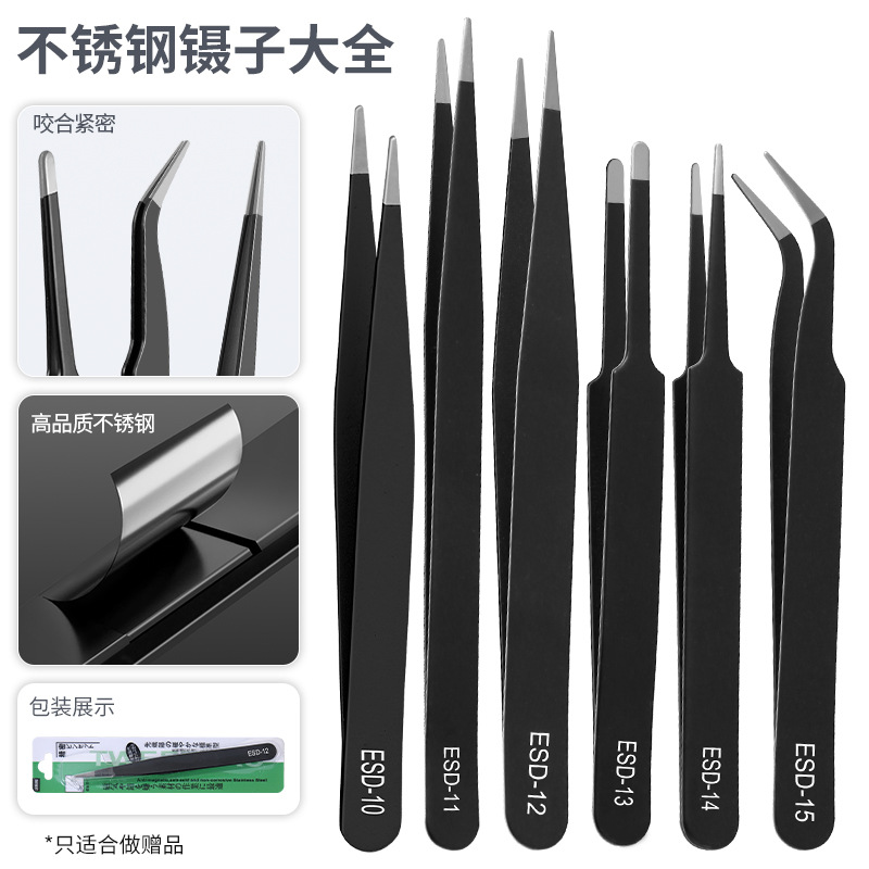Pinset akun tangan hitam baja tahan karat, alat perbaikan ponsel anti-statis, penjepit rambut sarang burung ESD presisi runcing