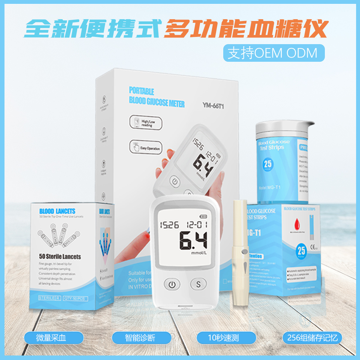 Pengukur glukosa darah Inggris netral penguji pengukur glukosa darah otomatis rumah tangga dengan strip uji glukosa darah 50 dan 50 jarum