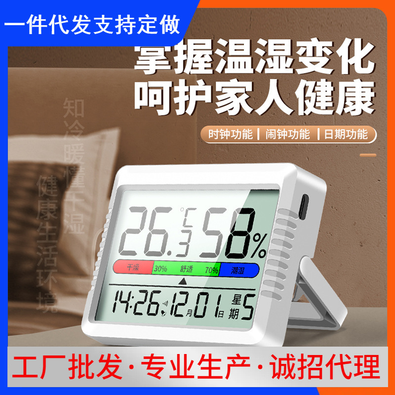 Produsen Termometer Pengukur Suhu Langsung Tipe Isi Ulang Jam Alarm Rumah Dalam Ruangan Layar Besar Multifungsi Pengukur Suhu dan Kelembaban Digital