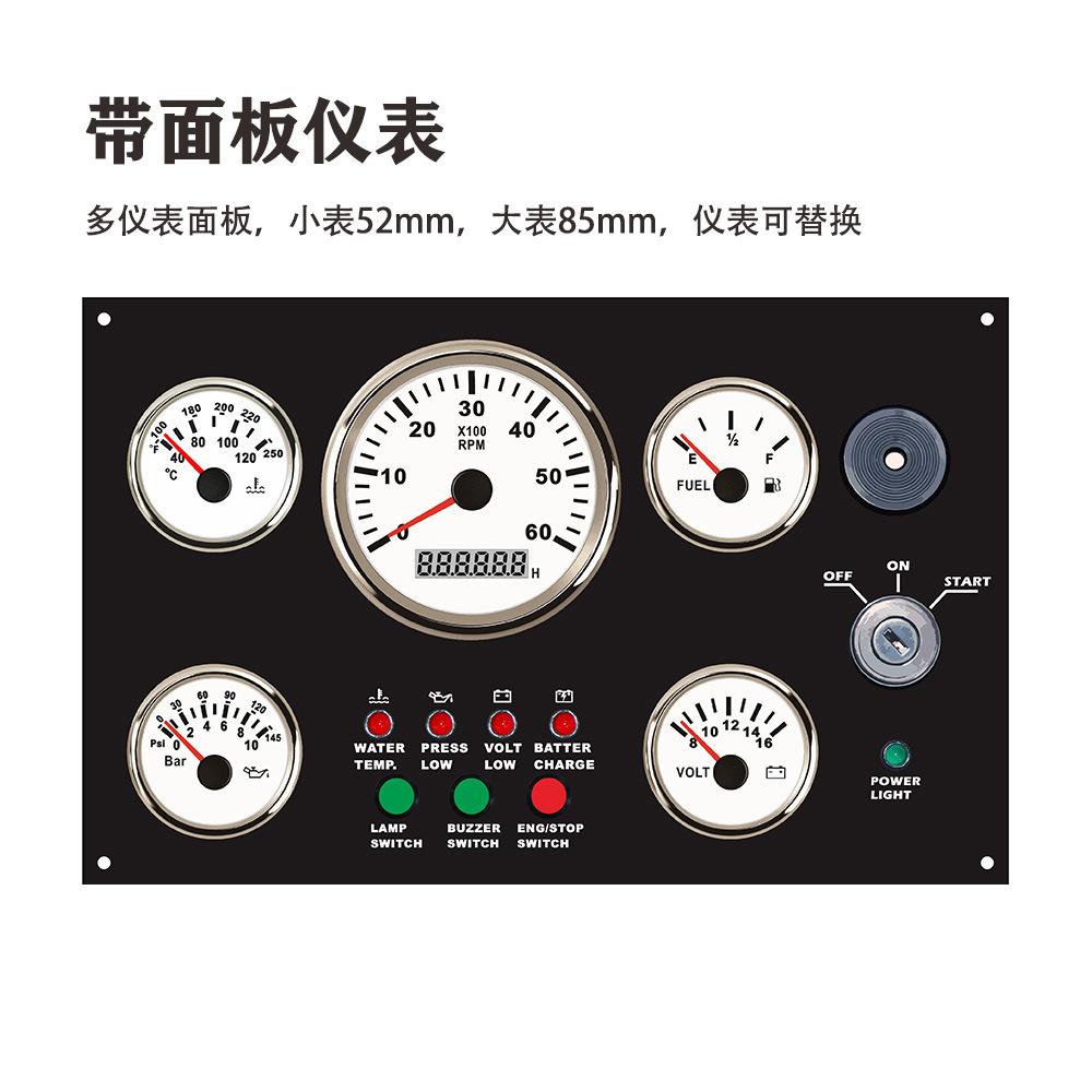 Instrumen panel modifikasi mobil perahu, instrumen kombinasi panel dengan suhu air tegangan tekanan minyak level kecepatan minyak 300*190mm 12V/24V