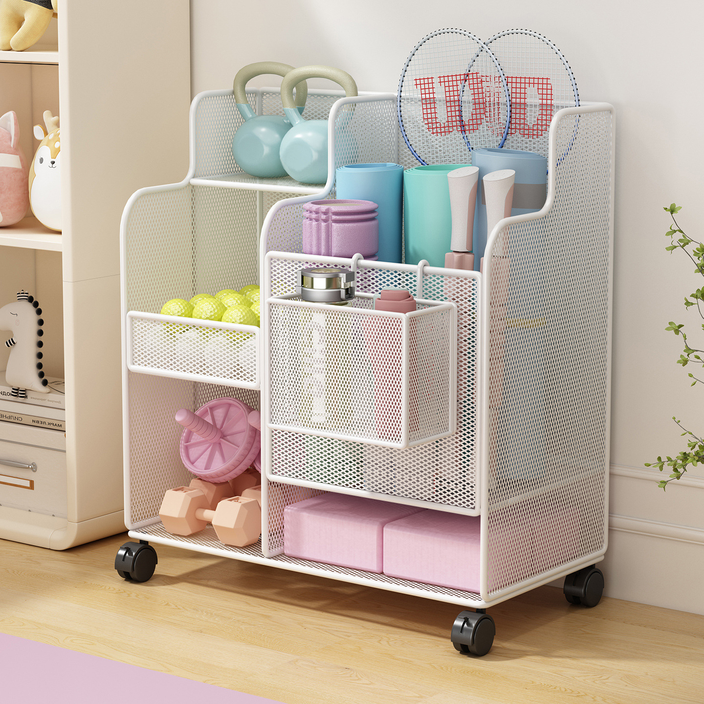 Alas Yoga Keranjang Penyimpanan Peralatan Olahraga Peralatan Olahraga Penyortiran Troli Kecil Rak Penyimpanan Bulu Tangkis Dengan Roda Rumah Tangga
