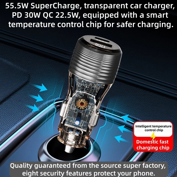Pengisi daya mobil transparan model pribadi 51W baru, pengisian daya super cepat, adaptor pengisi daya mobil dual-port Huawei Apple PD+QC