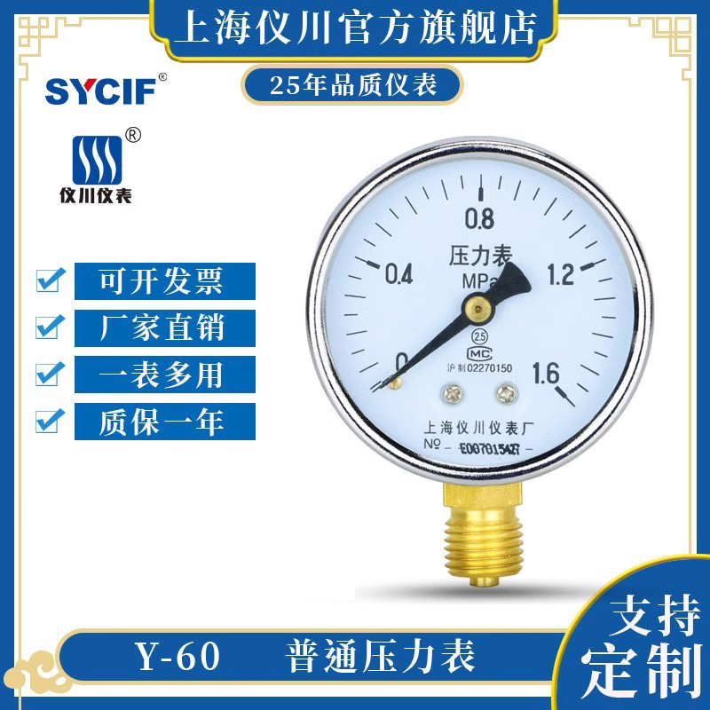 Shanghai Yichuan Instrument 60 Radial Tekanan Air Tekanan Tekanan Tekanan Minyak Pengukur Tekanan AC 0-1.6MPa Pemanas Lantai