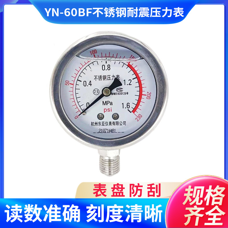 East Instrumen baja tahan karat YN60BF, pengukur tekanan tahan guncangan hidrolik 1,6mpa tahan guncangan suhu tinggi
