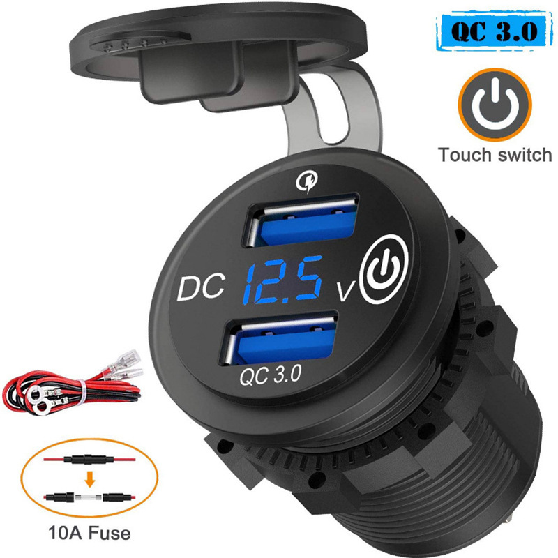 Dual USB dengan voltmeter layar digital tombol sentuh saklar ganda QC3.0 12-24V charger ponsel mobil
