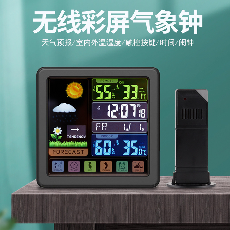Jam cuaca nirkabel multifungsi layar warna, jam prakiraan cuaca kamar bayi layar sentuh pengukur suhu dalam dan luar ruangan