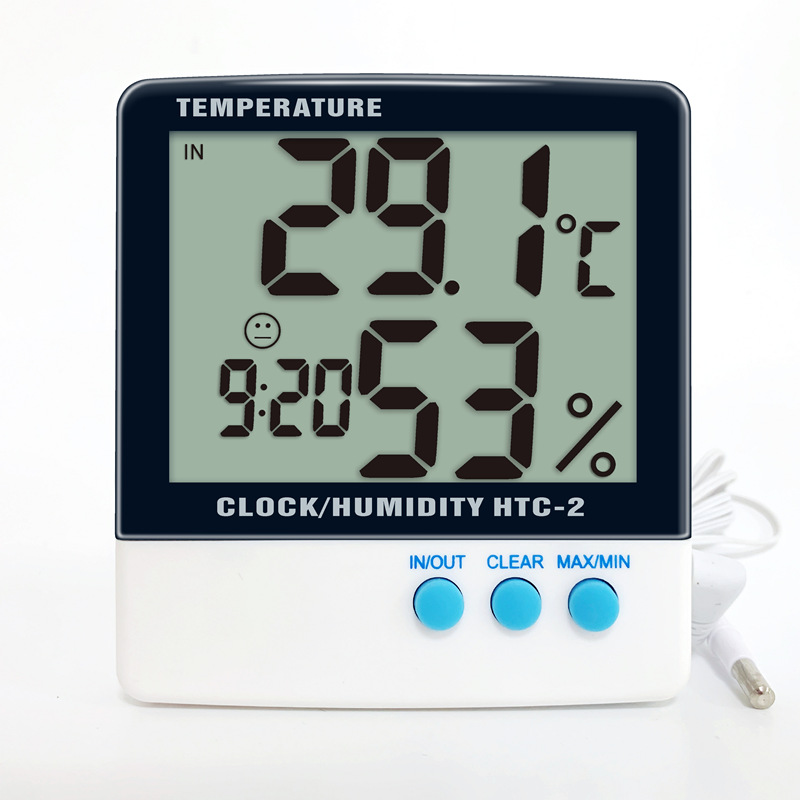 Termometer higrometer elektronik presisi tinggi, pengukur suhu dalam ruangan dan luar ruangan, display digital rumah tangga HTC-2