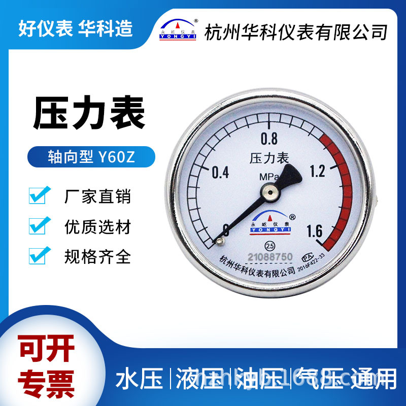 Huake/Yongyi Y60Z pengukur tekanan aksial, pengukur tekanan oli tekanan udara 0-1, 6mpa untuk tangki penyimpanan gas