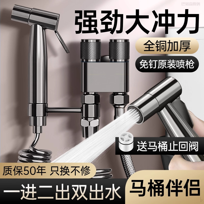 全铜马桶伴侣喷枪冲洗一进二出水龙头角阀带水枪高压厕所卫生间