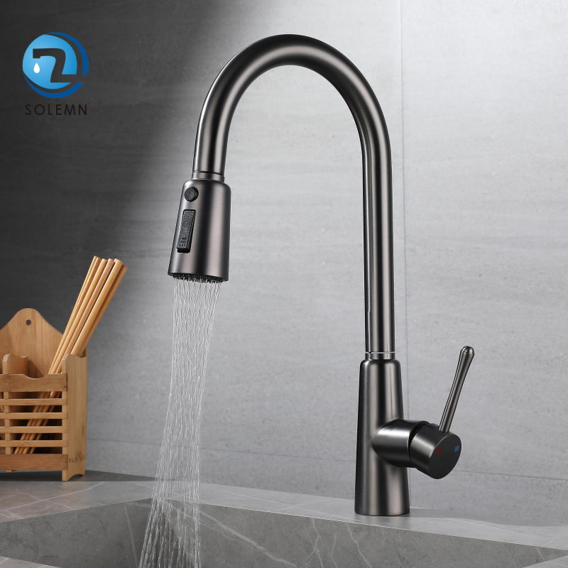 Keran dapur dapat ditarik keluar tembaga abu-abu pistol Guangdong keran cuci piring universal super terisi keran tahan percikan panas dan dingin